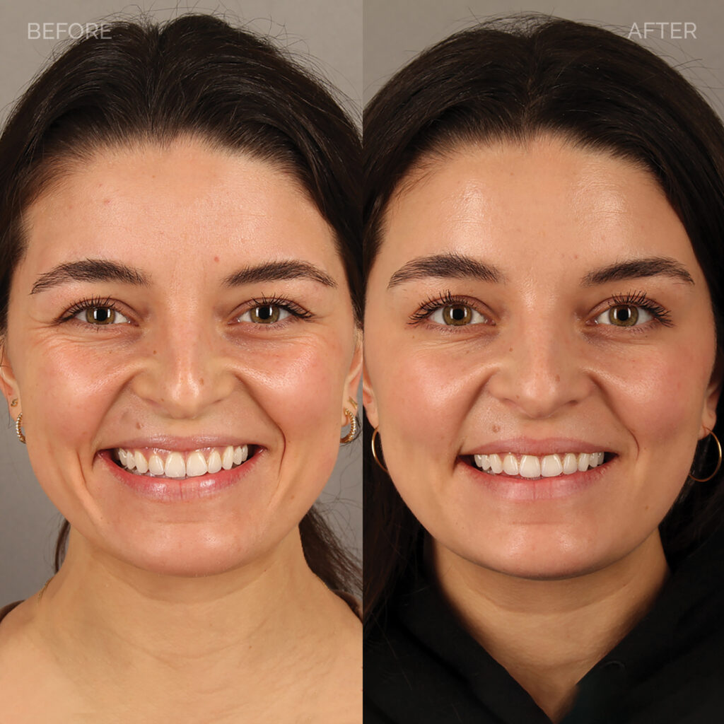 26-year-old female who requested softening of expression-related upper facial wrinkles, and the desire to prevent etched-in wrinkles from forming on her upper face. She is shown 2 weeks after Botox to her frown (“11 lines”) and around her eyes (“crow’s feet”).