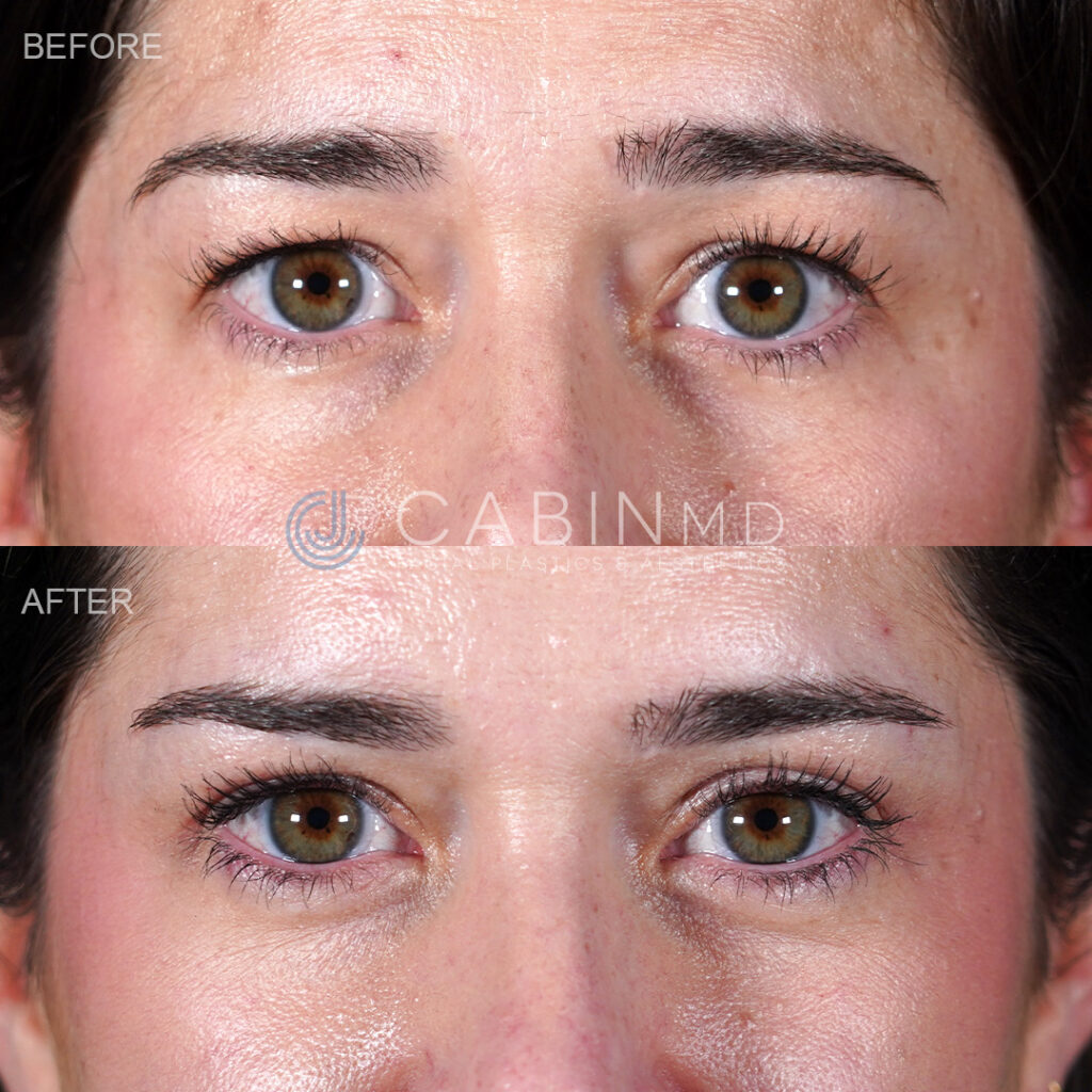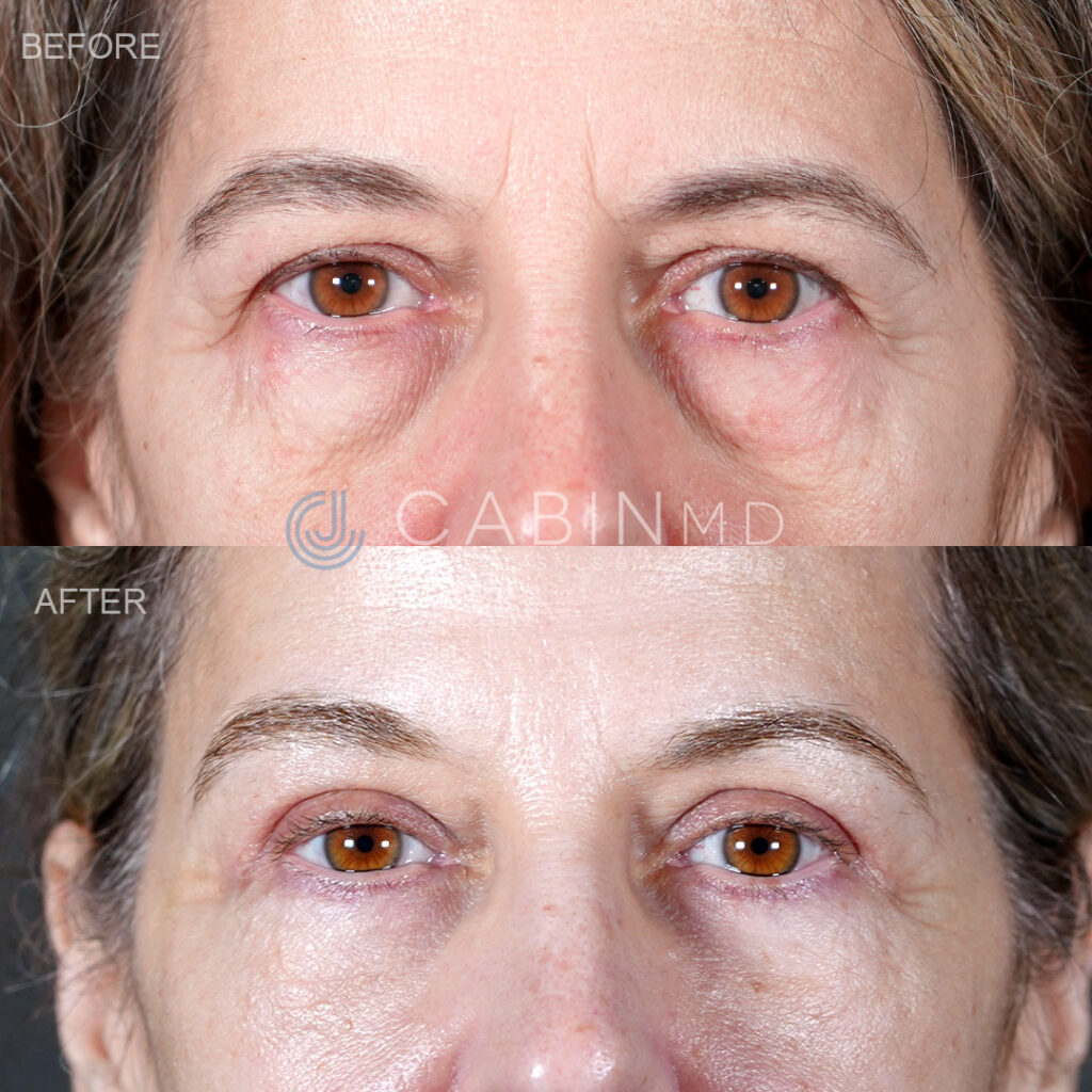 49-year-old female who requested in-office rejuvenation to tired looking eyes and upper face. She is shown 2 months after an in-office upper blepharoplasty with fractionated CO2 laser around the eyes, which has brightened the skin and eliminated many of the fine lines and wrinkles on and around her eyelids.