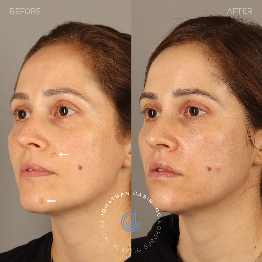 35-year-old female with a history of displeasure with two facial lesions. She is shown seven months after removal of these lesions, demonstrating minimal scar that is flat and easy to conceal with coverup.